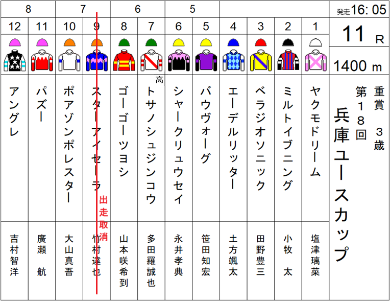 今シーズンは8週間の編成で開催される姫路競馬場は、今週から後半戦の5週目を迎え第3回開催がスタートした。ときおり冷たい突風が吹き荒れる時間帯もあったが概ね過ごしやすい穏やかな気候でレースが進んだ。天候晴、馬場状態は良で第18回兵庫ユースカップが行われた。今年は高知からの遠征馬が1頭、地元馬11頭の当初12頭の組合せになったが9番のスターアイセーラが出走取消、11頭立てとなり施行された。