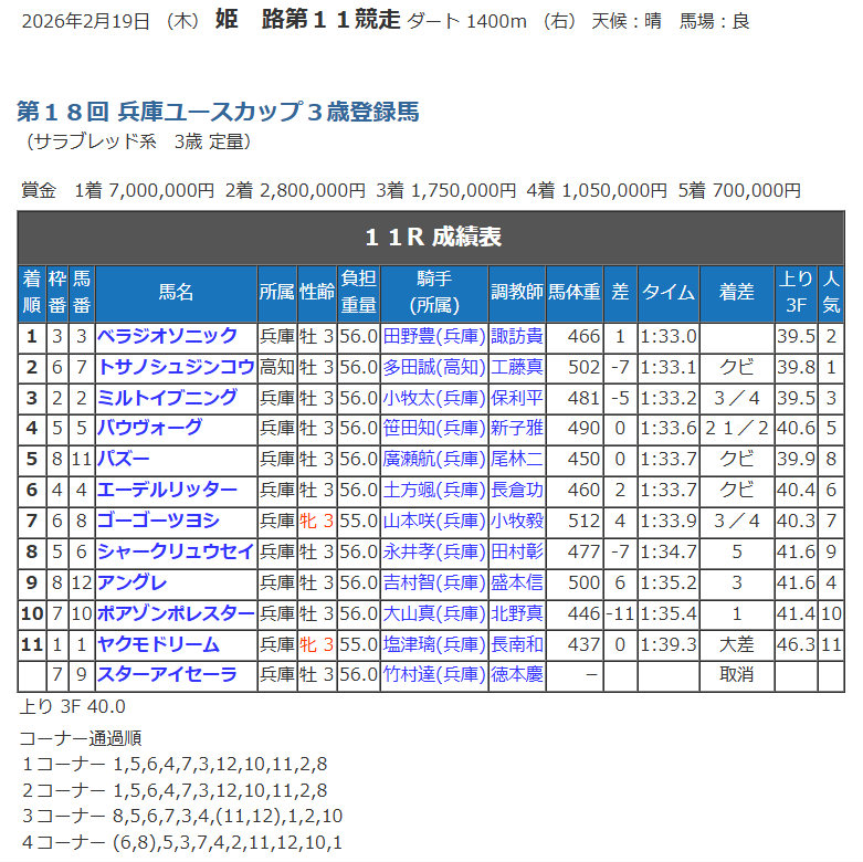今シーズンは8週間の編成で開催される姫路競馬場は、今週から後半戦の5週目を迎え第3回開催がスタートした。ときおり冷たい突風が吹き荒れる時間帯もあったが概ね過ごしやすい穏やかな気候でレースが進んだ。天候晴、馬場状態は良で第18回兵庫ユースカップが行われた。今年は高知からの遠征馬が1頭、地元馬11頭の当初12頭の組合せになったが9番のスターアイセーラが出走取消、11頭立てとなり施行された。