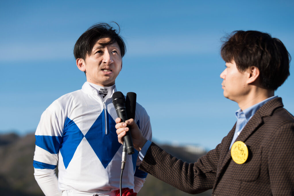 インタビューの第一声、「前評判通り、いいレースができたかなと思います」と、落ち着いた口調で答えた吉村騎手。