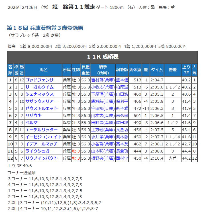 (ちなみに姫路の不良馬場は、2025年の3月4日と5日以来。園田を含めると2025年の12月25日、兵庫ゴールドトロフィーデー以来となる)