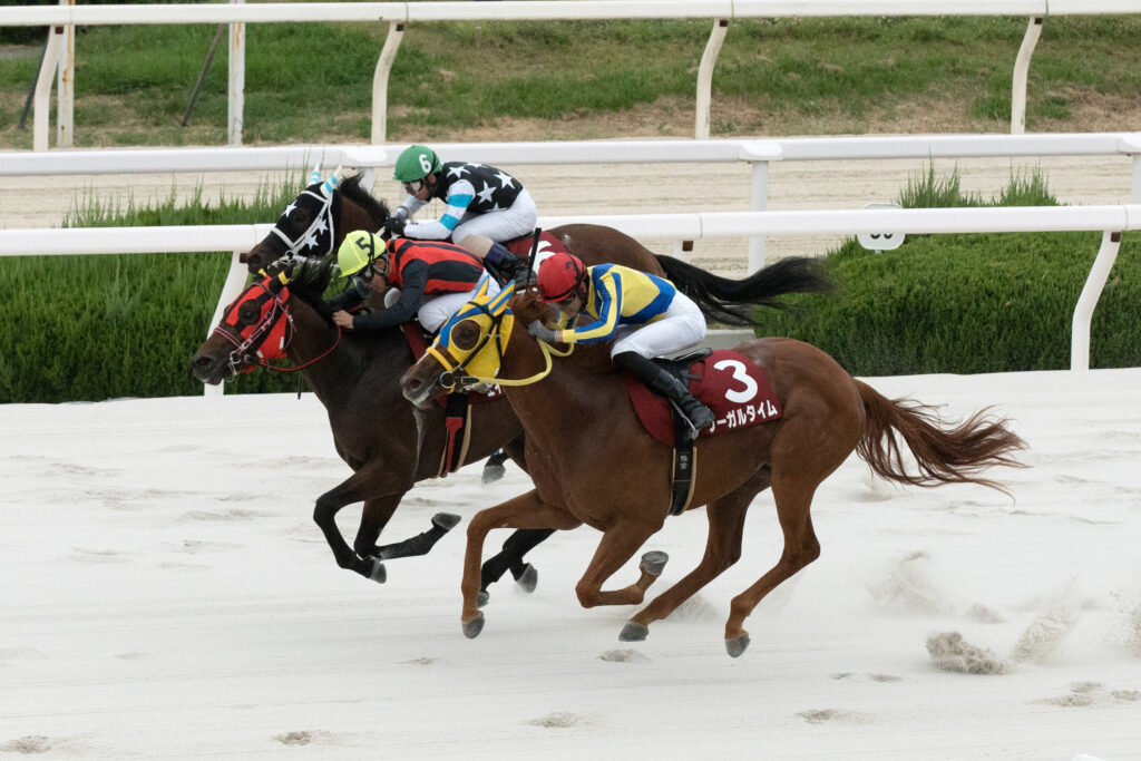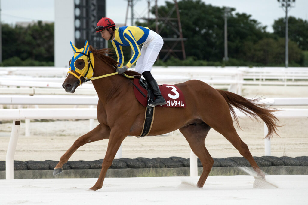 その中で単勝1番人気(単勝2.1倍)に支持されたのがリーガルタイム。7月31日のデビュー戦(1400m)は、スタートしてから少し若さを見せる部分がありながらも、勝負所から当時深いと言われていた内の馬場を巧みに進んで今回再戦となるアングレとのマッチレースに持ち込み、クビ差で勝利をものにした。1分31秒3という時計は園田競馬場が白砂に変わった2020年以降の新馬戦(兵庫のレース名としては初出走)では最速タイムという記録のおまけつきであった。