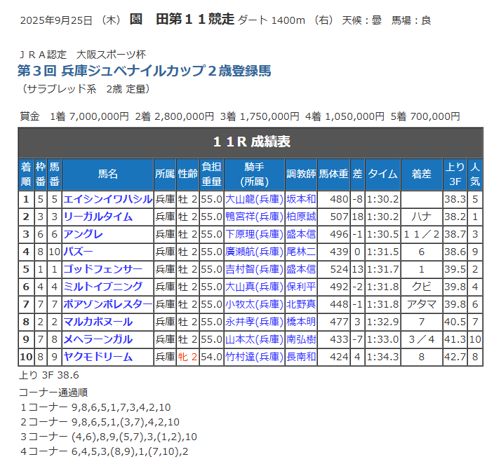 レースを制したのは・・・外の2頭の中では内にいたエイシンイワハシルの方であった。外のリーガルタイムがハナ差で2着。1馬身半差の3着がアングレという結果に終わった。そこから6馬身離れた4着がパズー。ゴッドフェンサーが5着で入線した。
