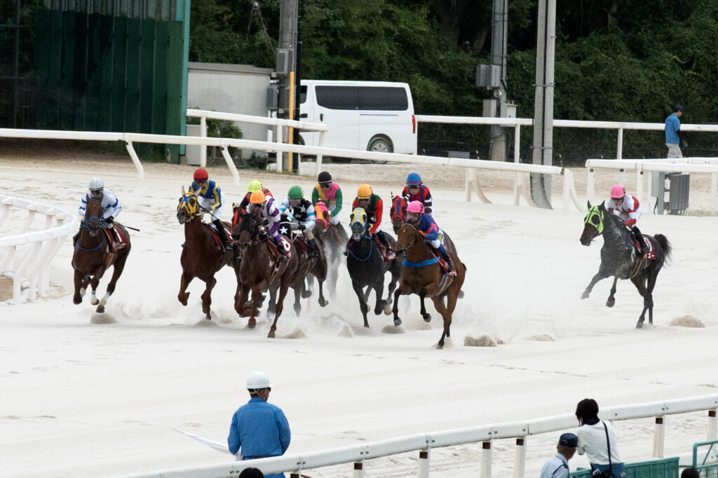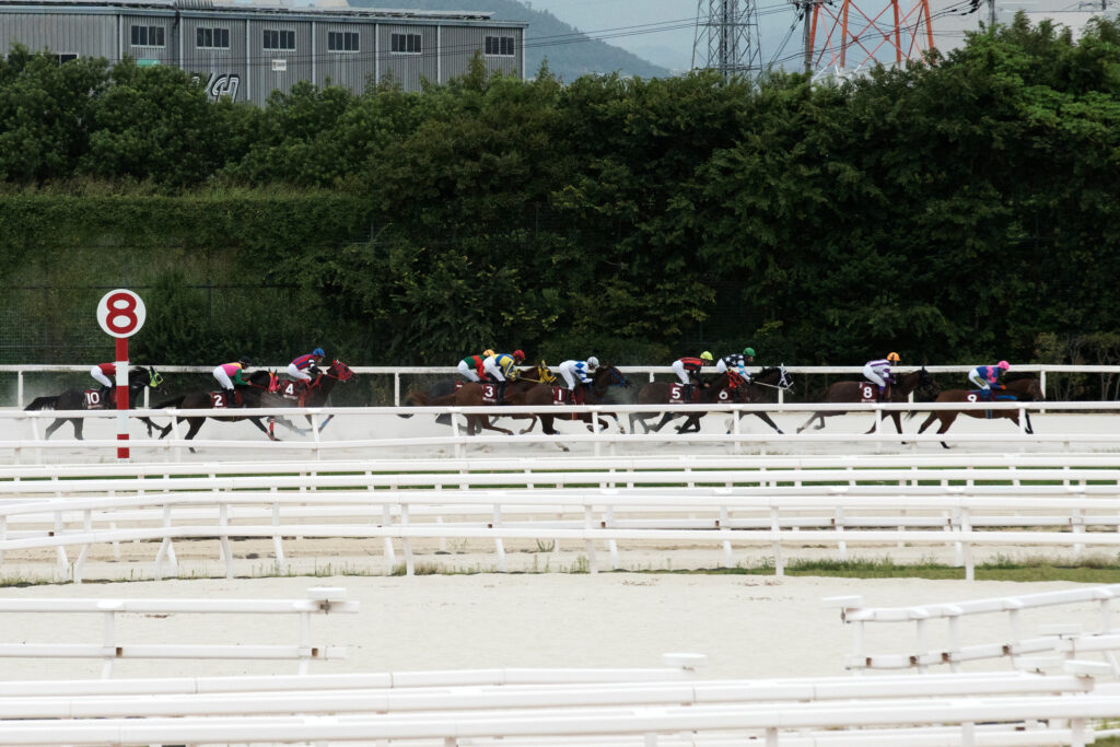 園田競馬場では8月に入ってから820m、1230mなどの短距離戦を除いて勝負所の3コーナー(1700mや1870mでは2周目の3コーナー)の攻防をパトロールタワーからのカメラが捉えている。ぜひこのレースの勝負所のカメラワークをご覧いただきたい。3コーナーに入るところで先団にいる7頭がほぼ一塊となっているが、ここで各馬各ジョッキーの思惑が交錯し、リーガルタイムはやや狭くなりきもち後退、空いたスペースにうまり潜り込むエイシンイワハシルの姿が見られる。この攻防がこのレースのキモとなったといっても過言ではない。