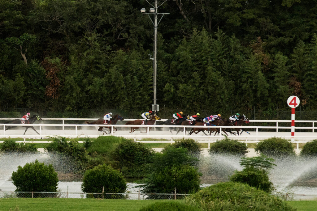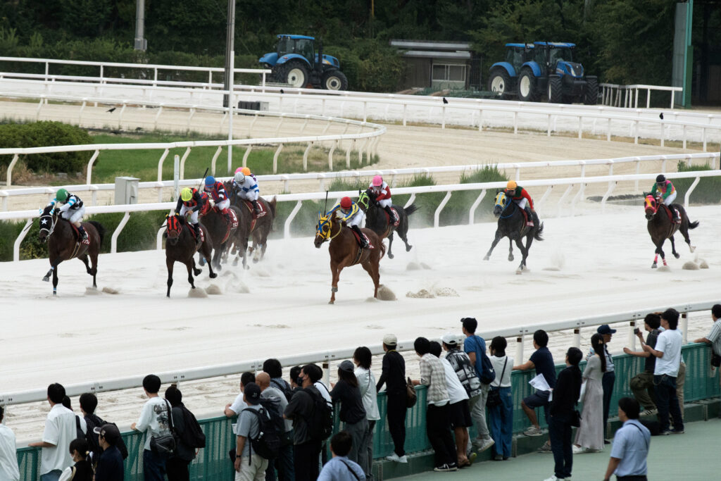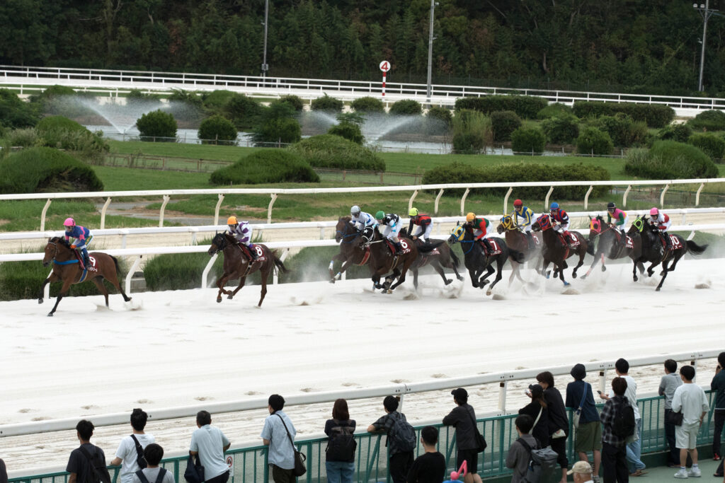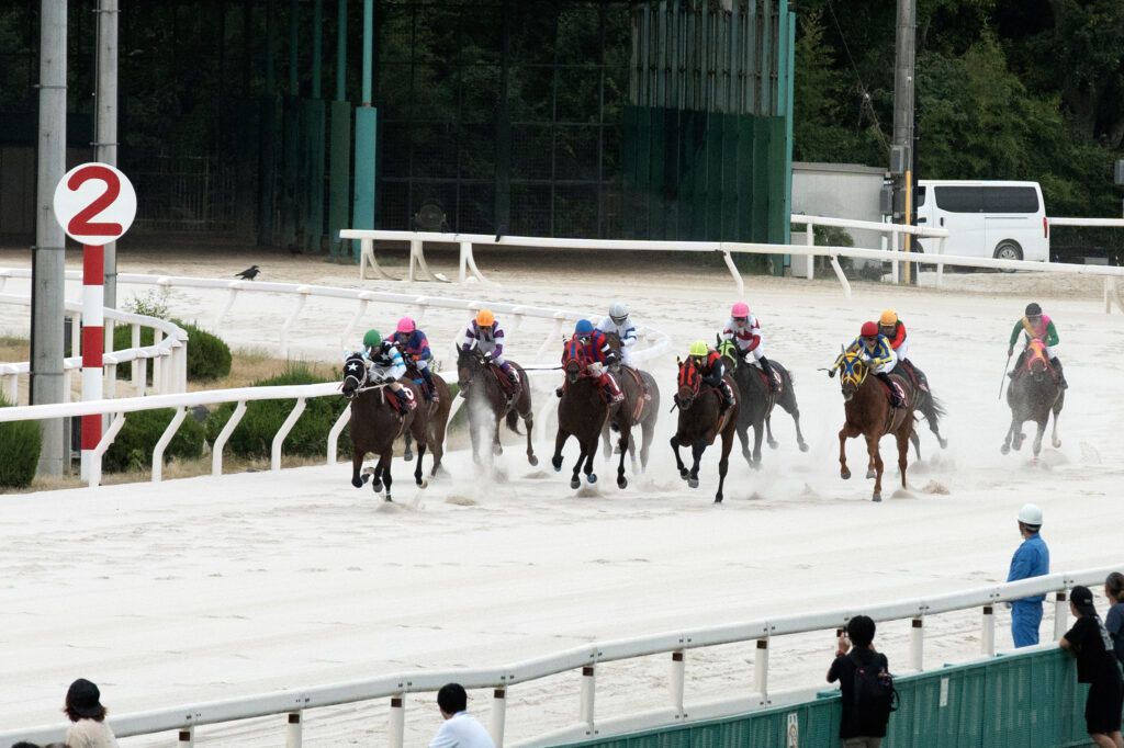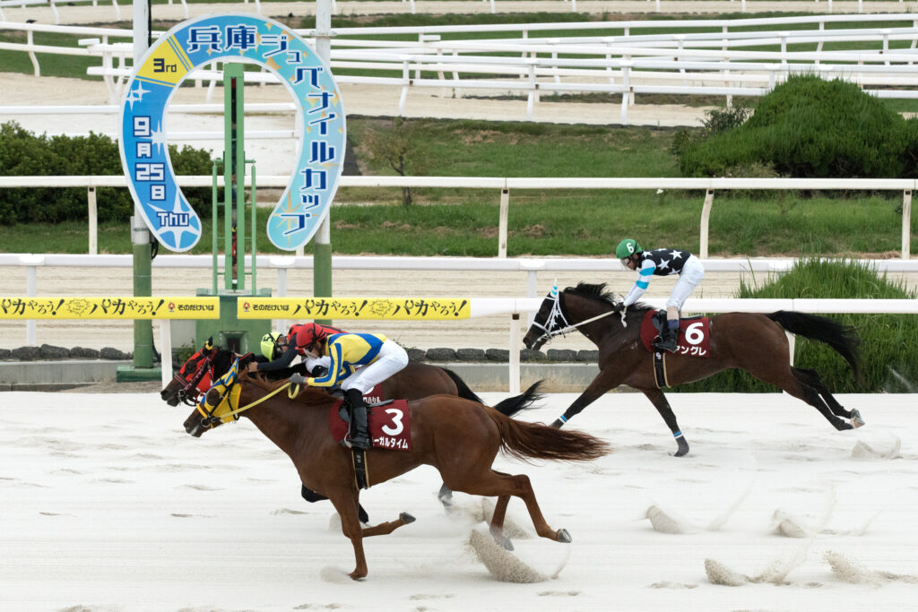 ようやく気候は秋めいて、日中30℃を超えることが少なくなりこの日も最高気温は28℃台。午前中に少し雨がパラつくシーンも見られたがそれも数十分程度、厚い雲に覆われながらもその後は雨に見舞われずに天候は曇り、馬場状態は良で第3回兵庫ジュベナイルカップのスタートを待った。ゲートが開く直前で内枠の2頭、マルカボヌールとゴッドフェンサーが脚をバタつかせ首を下げるなど少しうるさい仕草を見せながらも事なきを得て、いよいよゲートが開く。