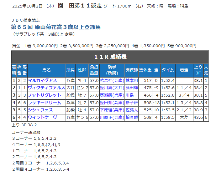2着は逃げた大井のヴィクティファルス。逃げる競馬は初めてだったが、鞍上の絶妙なペース配分に導かれて最後までよく粘った。船橋のノットリグレットがラッキードリームを抜き去って3着を確保。上がり最速タイの脚を披露して馬券圏内に入ってきた。ラッキードリームは4着。シシュフォスは5着に終わった。
