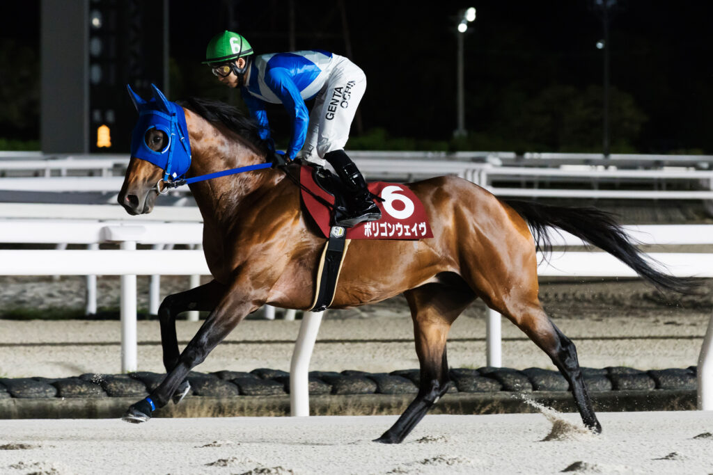 2022年春に門別の田中淳司厩舎からデビューしたポリゴンウェイヴ。そのときの主戦は落合玄太騎手。このコンビが3戦目に挑んだのが重賞、栄冠賞である。このレースを勝利したのはコルドゥアン。そう、短期免許で門別で騎乗していた石堂響騎手がコルドゥアンで1番枠からの大外一気で単勝万馬券、大穴を開けたレースで覚えているファンの方も多いだろう。そのときの3着がこの馬だったのだ。ポリゴンウェイヴは4戦を消化した後、南関東に身を置き、落合玄太騎手とは物理的にも離れざるを得なかったが、その後も2戦で手綱をとったものの、重賞制覇には手が届かなかった。栄冠賞から3年の時が流れ、今や北海道でリーディング争いをしている落合玄太騎手がこのタイミングでポリゴンウェイヴ復活の起爆剤になるとは競馬の神様も粋な演出をするものである。検量で下馬する際には石堂響騎手とグータッチを交わすシーンが見られたことも付け加えたい。