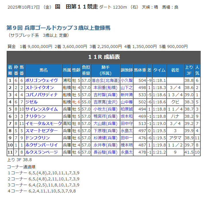 2着は船橋のストライクオン、3着にも船橋のコパノパサディナが、そして4着には同じく船橋のジゼルが入線し、南関東勢が上位を独占する結果となった。この距離適性もさることながら、南関東の層の厚さをまざまざと見せつけられる結果となった。