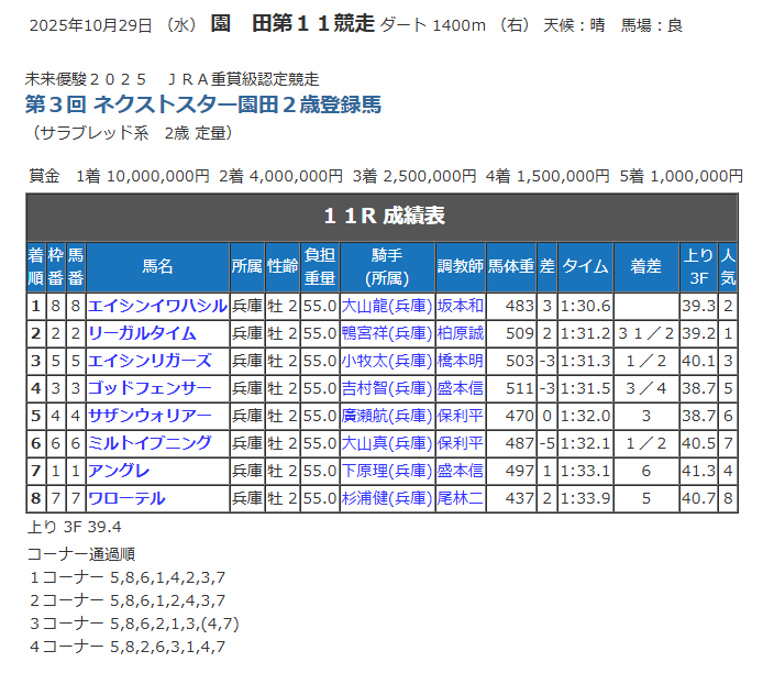 今回も勝ち馬に後塵を拝すことになったリーガルタイムとて小差、3着以下の敗戦の談を聞くとそれぞれの陣営にはそれぞれの理由があり、決して力負けというわけではない気がしてならない。まだ勝負付けは終わっていないはずだ。来年の兵庫3歳クラシックに向けて各陣営がまたそれぞれのステップを目指すことになる。