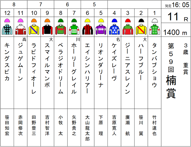 4番人気は、単勝8.7倍で地元兵庫のべラジオドリーム。重賞は未勝利だが、これまで重賞2着6回、3着1回と大舞台でも堅実に走ってきている。前回の自己条件戦(C1)は勝たないと楠賞に出られないという状況だったが、危なげない競馬で勝利し目標としていたレースへの出走が叶った。これまでは兵庫無敗の三冠馬となったオケマル、今回も戦うケイズレーヴと名勝負を演じてきた馬だけに軽視は禁物だ。