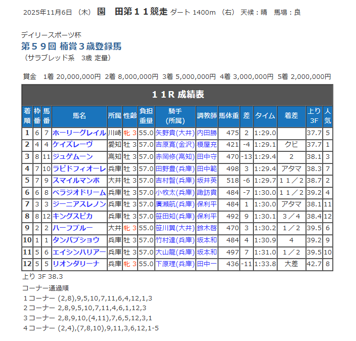 経済コースを通ったホーリーグレイルが前を行くケイズレーヴとの差を徐々に詰めていく。残り50m付近で捕まえるとさらにもうひと伸びをみせてクビ差先着。直線の伸び比べを制して、地方3歳短距離ナンバーワンの称号を獲得した。